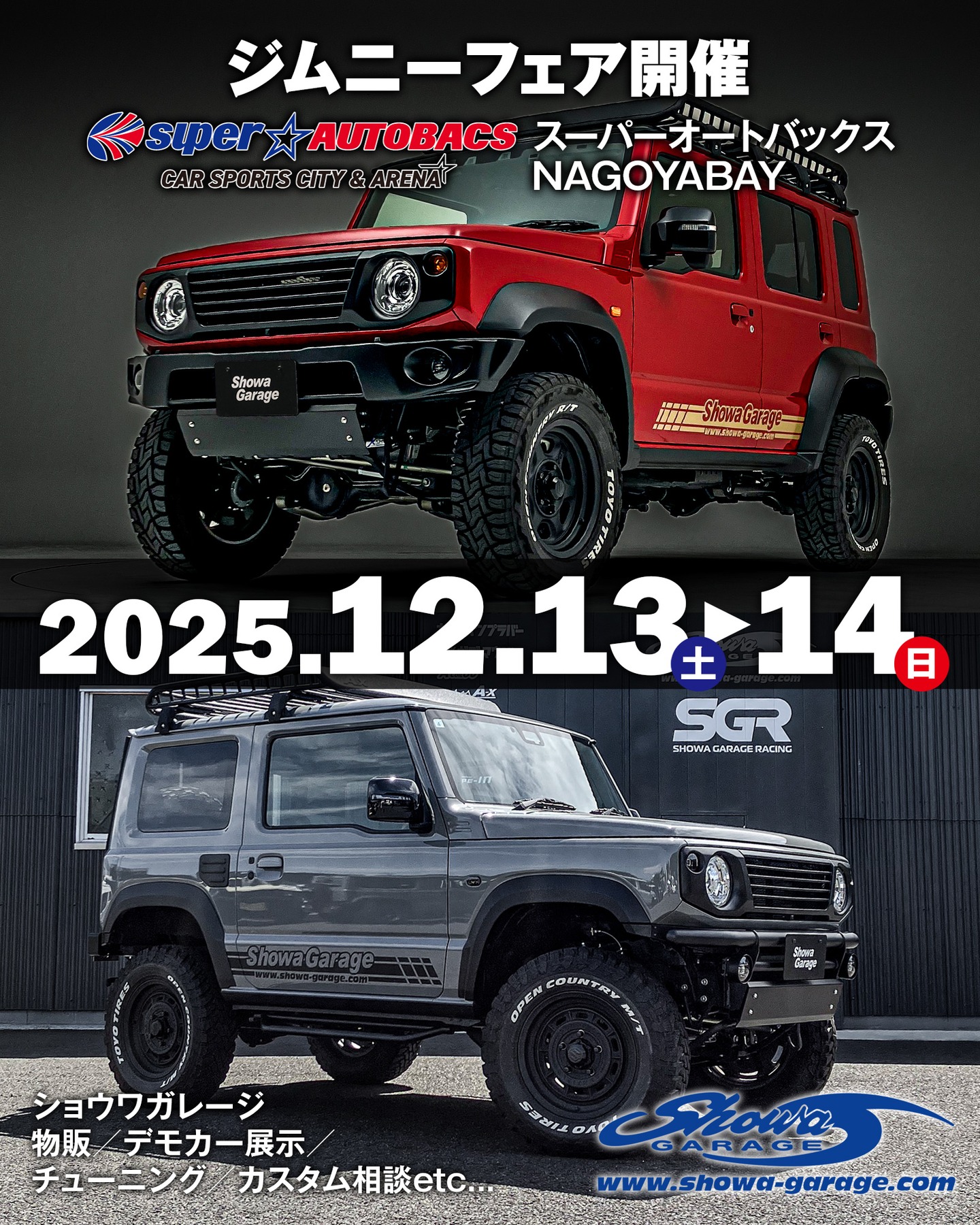ショウワガレージは、赤色のJC74 ノマドと、アイアンバンパー装着のJB64 ジムニーの2台を展示する予定。当日は、デモカーを前に製品や各種グッズをイベント特別価格で販売するほか、チューニングやカスタムに関する相談も受け付ける。