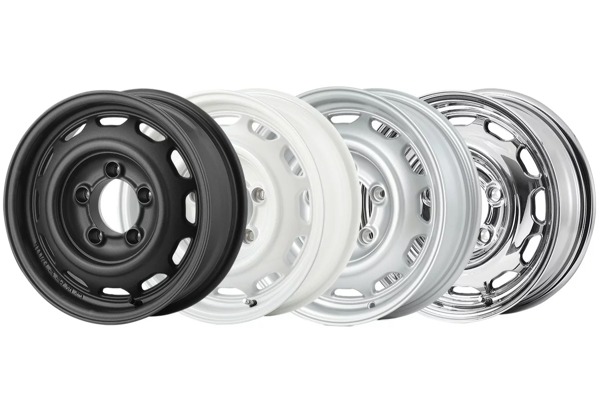 クラシックなスチール風デザインながら、素材は軽量で強度に優れるアルミ鋳造のホイール。カラーは「アイアンブラック」「ホワイト」「ブライドシルバー」「ブライドクローム」の4色展開しており、別売のセンターキャップと組み合わせることで、よりクラシックで好みのデザインに仕上げることができる