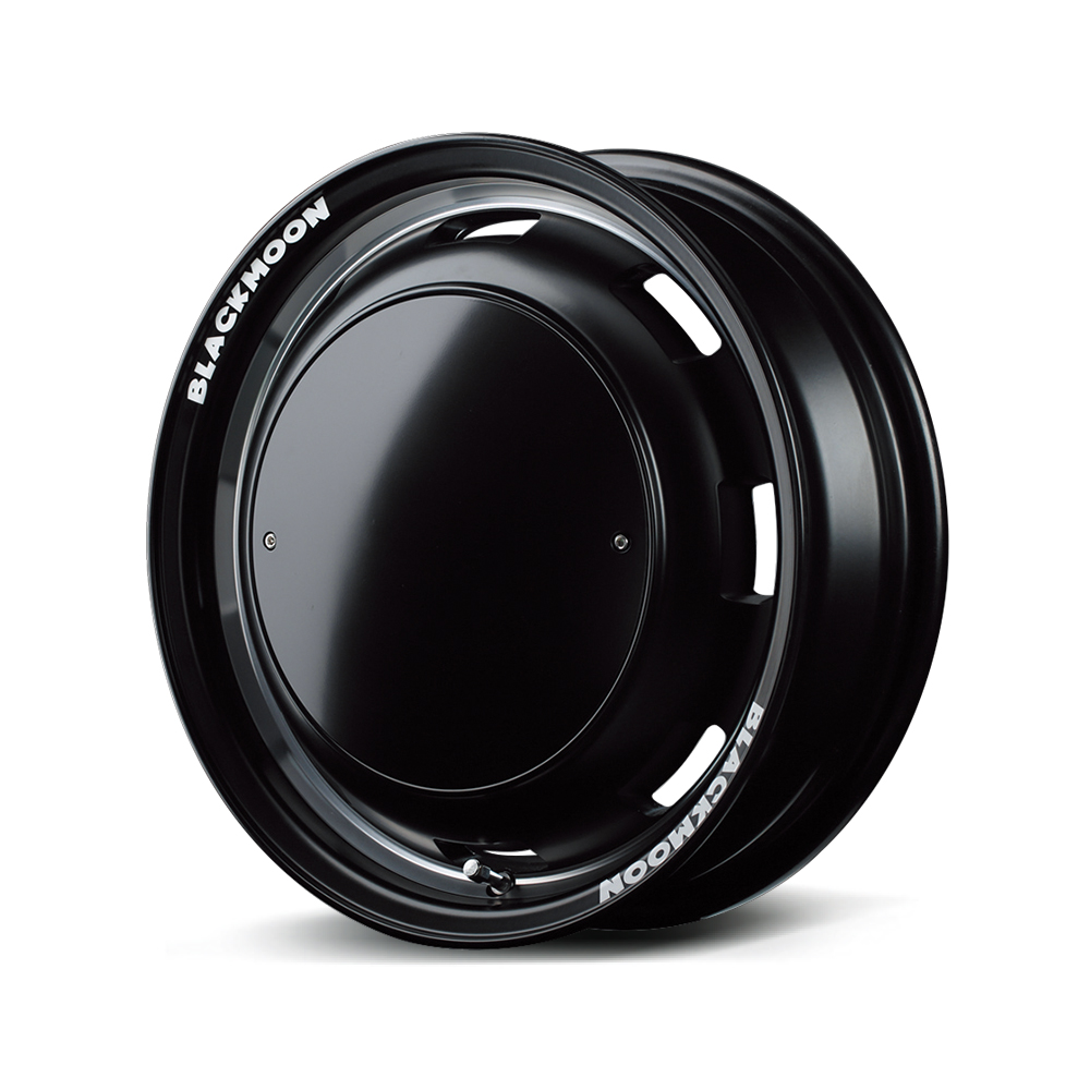 ホイール中央部に装着するセンターパッケージは着脱可能で、都会的なブラックディッシュ仕様から、センターキャップ装着でクラシックなデザインに変えることができる。またセンターパッケージボルトはクロームメッキ以外に5色用意されており「イエロー」「オレンジ」「レッド」「グリーン」「ブルー」の5色から選ぶことができる。写真のホイールに貼られている「BLACKMOON」ステッカー 2枚も付属している。