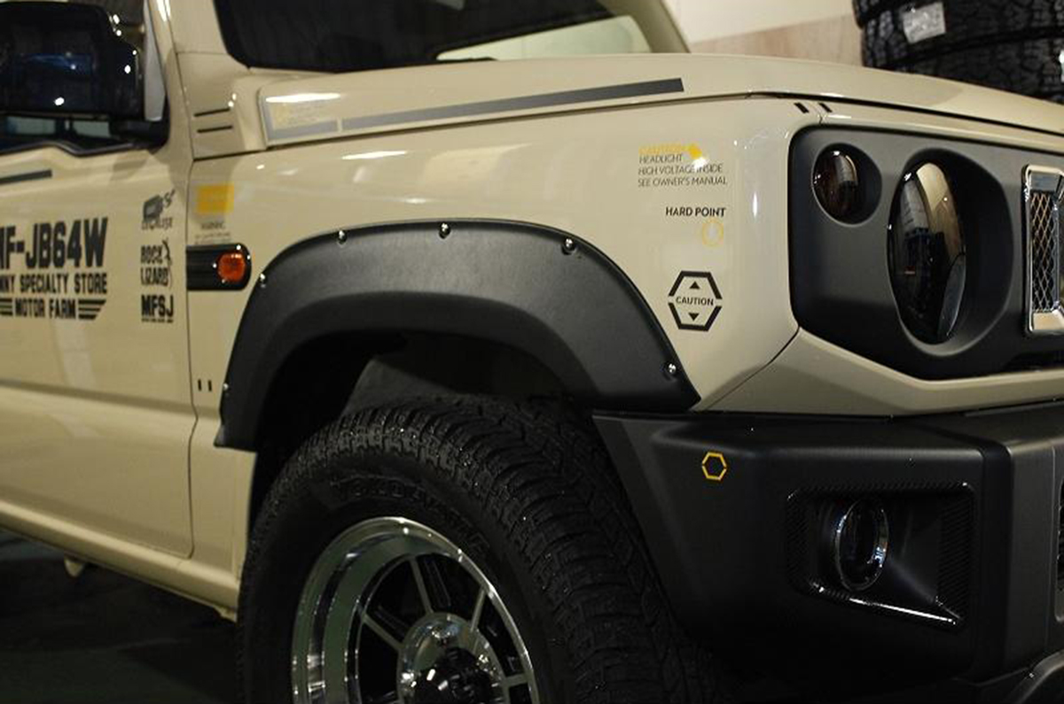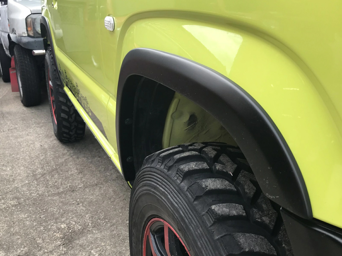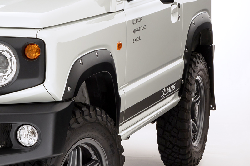 マットブラックに塗装されたオーバーフェンダーにリアルなダミーボルトを加えたデザインはジムニーにワイルドさを引き立たせる。ダミーボルトはオプションで「クロームメッキ」から「ブラック」を変更することができる。純正マッドフラップの取り外しが必要な点、リアフェンダー内側に穴あけ加工が必要