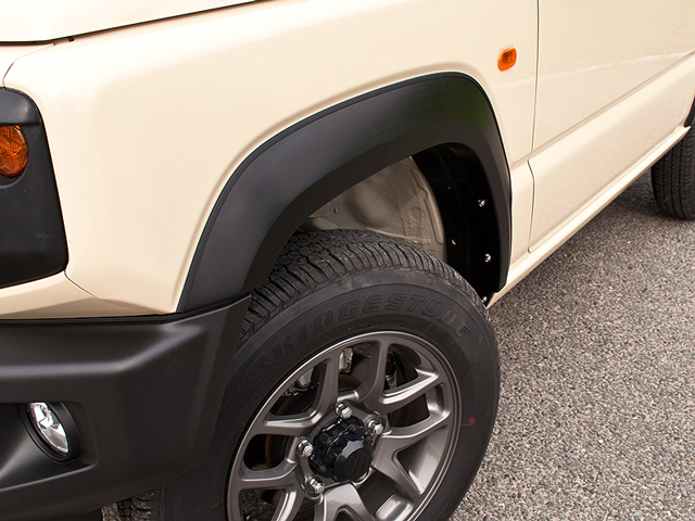 存在感のある面の広いオーバーフェンダーでジムニーにボリューム感をプラスさせる。フェンダーはサイドシルまでではなく、途中のプレスラインまでになっている。フェンダー表面が皮シボ調になっているほか、ダミーリベットがあることで、より無骨でワイルドさを演出するデザインになっている