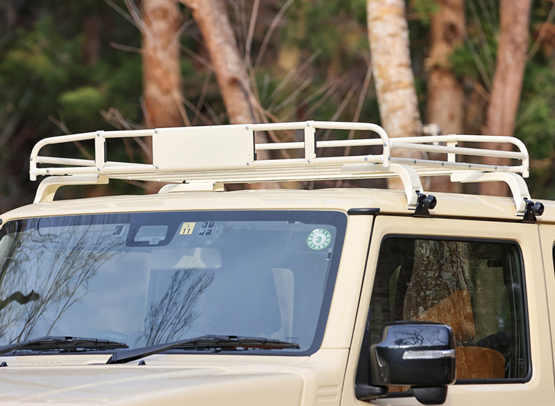 どこか懐かしさを感じさせるようなクラシックなデザインのルーフラック。他社製のルーフラックは基本的に黒色の塗装が施されているが、こちらのルーフラックはオフホワイト塗装がされている。そのため、ジムニーの純正色「シフォンアイボリーメタリック」との相性がとても良い