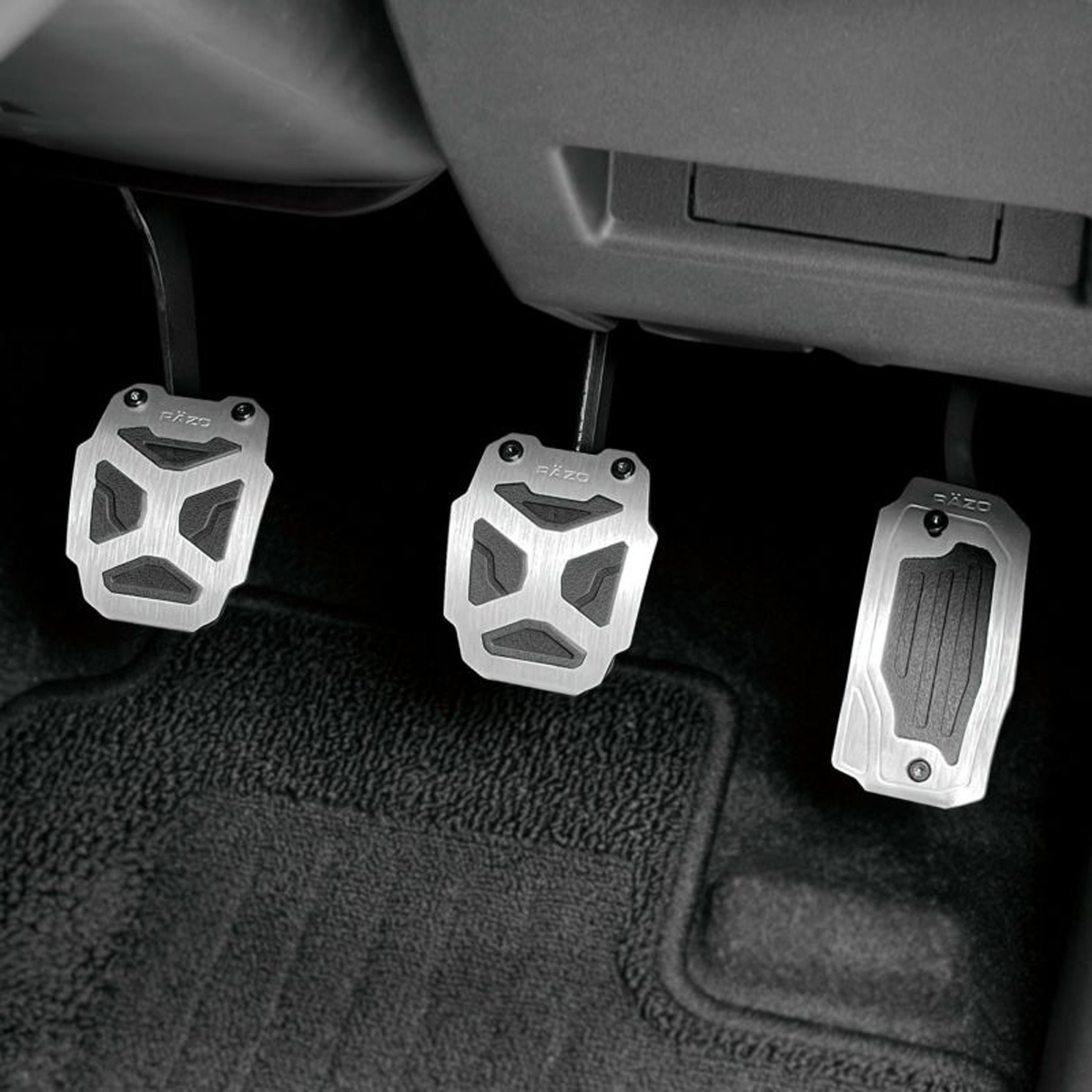 スポーツドライビングから街乗り通勤まで考慮されたペダルカバーで、ブレーキペダルはバーリング加工を施しグリップ力を強化。アクセルペダルはフラット形状で適度に滑りやすく、スムーズなペダルワークができるよう設計されている。ペダル下部は窪めた形状になっているので、踏みかえ時に引っかからないよう工夫されている