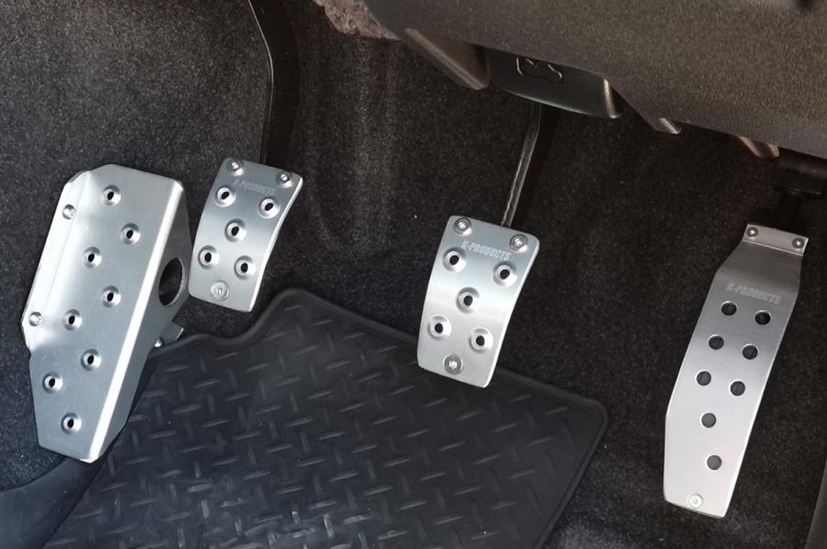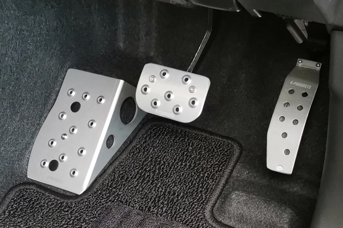 ブレーキペダルはアルミに開けた穴の周囲を円筒状に立ち上がらせるバーリング加工を施しグリップ力を強化している。アクセルペダルは穴あけ加工だけを施し、滑りやすくスムーズなペダルワークができるようになっている。両方ともアルマイト処理がされているので金属光沢を活かしつつ、耐食性・耐摩耗性に優れている