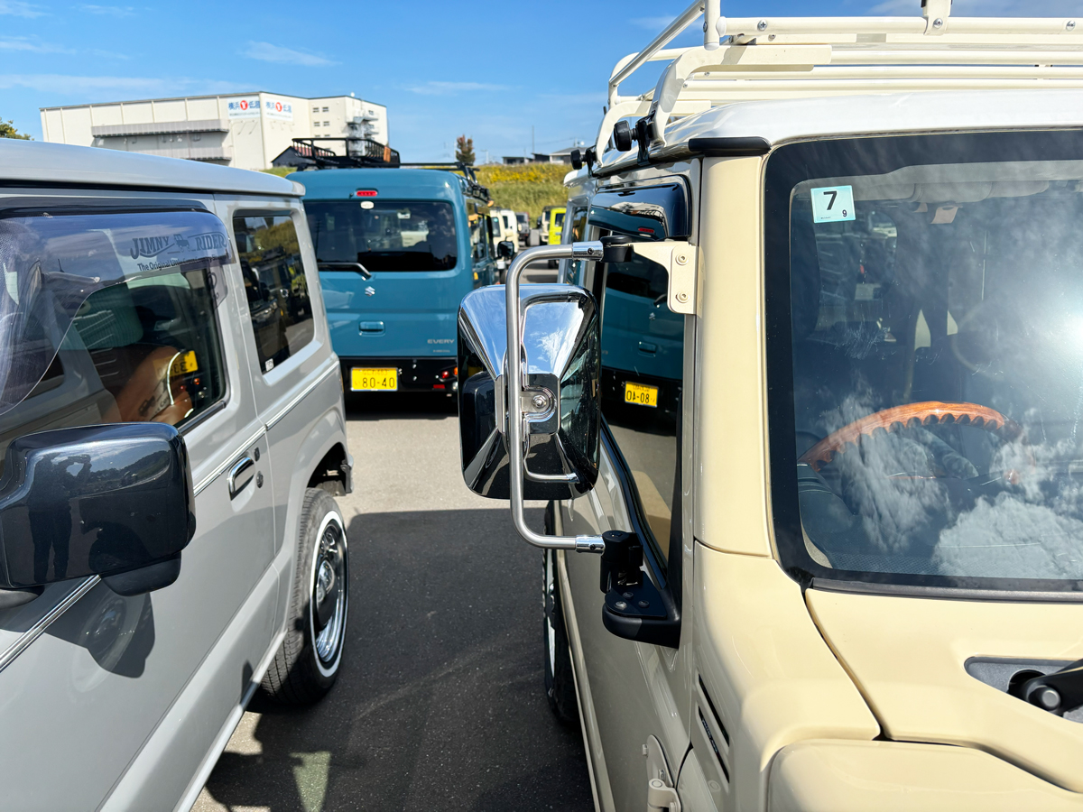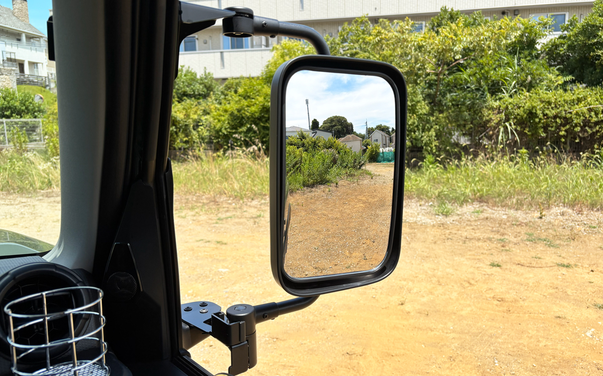 トラックミラーは、上部をドアパネルに挟み込む構造とし、下部は純正ドアミラーのマウント部を利用してビス固定する方式を採用している。固定には両面テープも併用されており、走行時に動かないよう配慮された構成となっている。