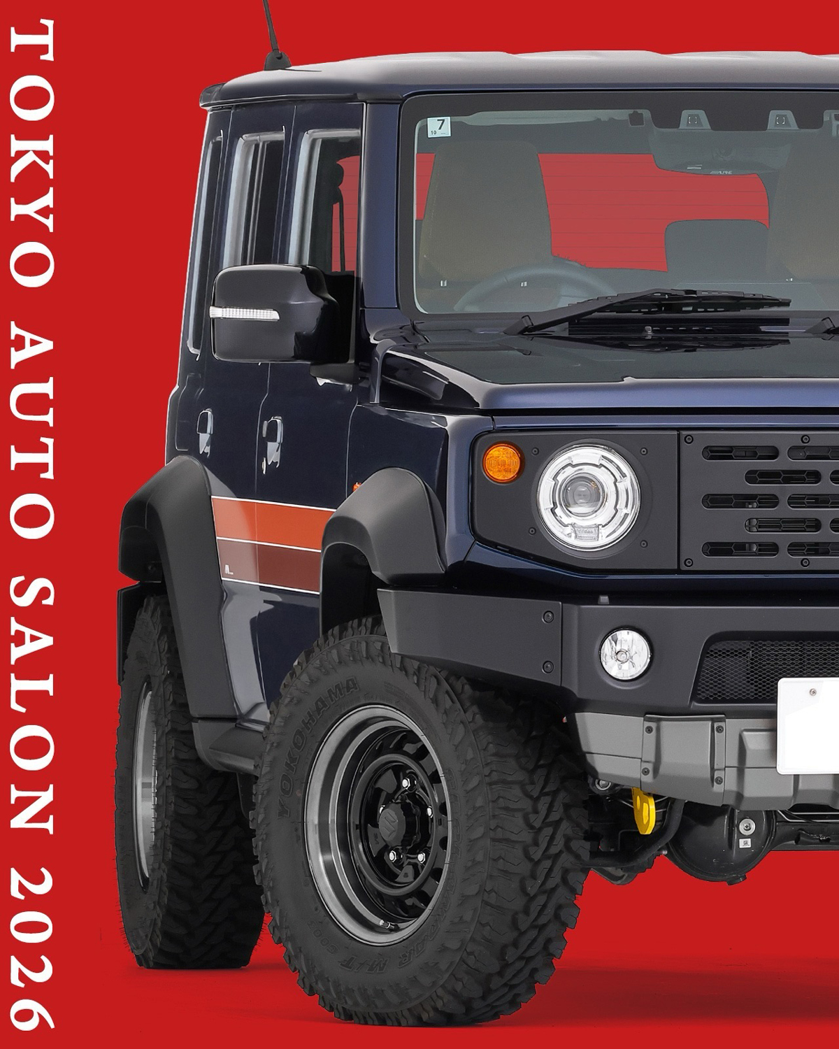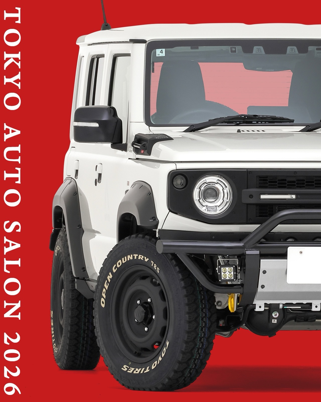 もう1台のジムニーノマド展示車両として、「APIO JIMNY NARROW NOMADE JC74-TS zero」が出展される。本車両は、ジムニーノマド専用ナローフェンダーおよびサイドシルガードを装着した仕様となっており、これらのパーツは東京オートサロン2026の会場で初披露される。