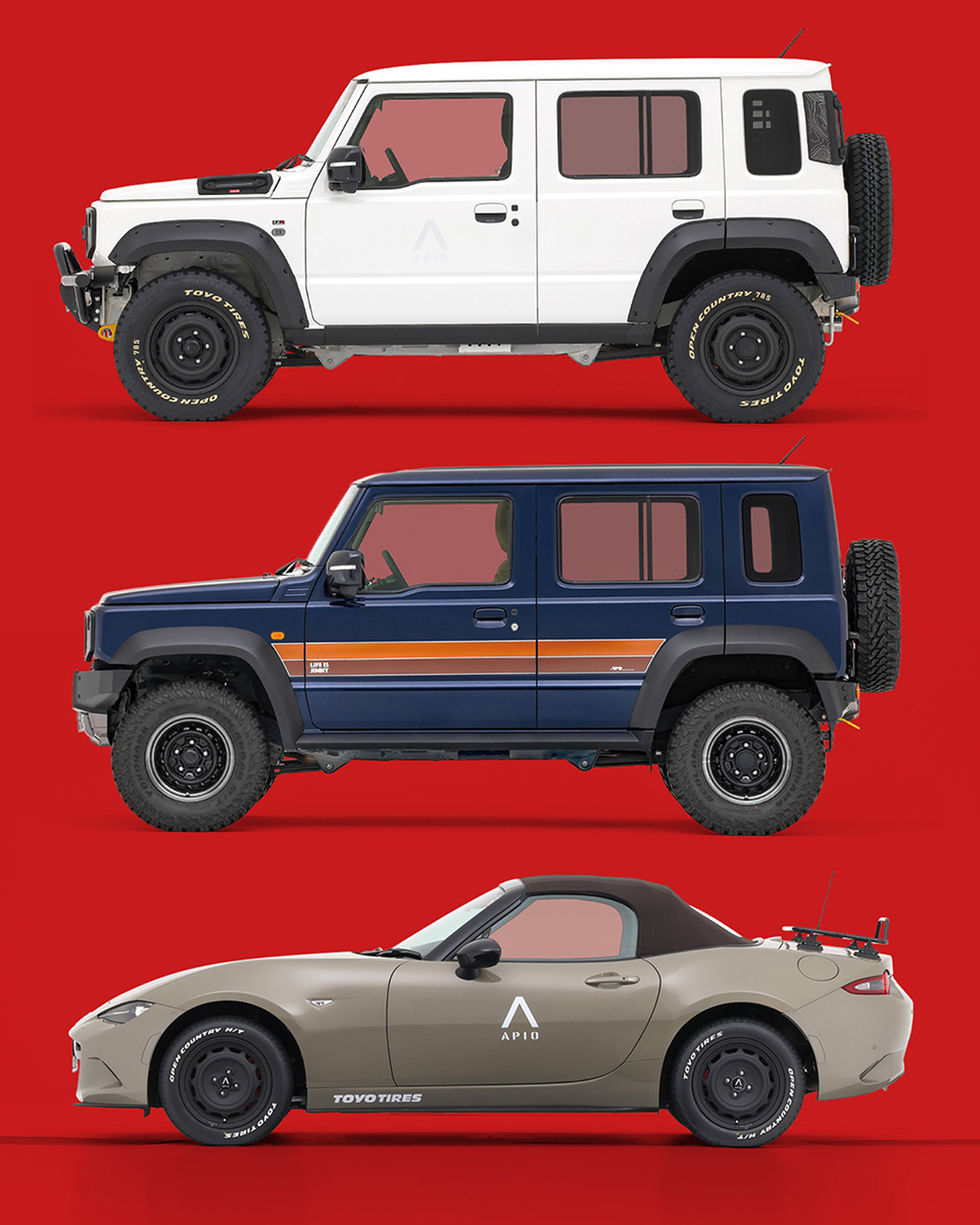 また計3台の車両が展示される予定となっており、スズキ・ジムニーノマドをベースとしたカスタム車両が2台、マツダ・ロードスターNDをベースとした車両が1台である。