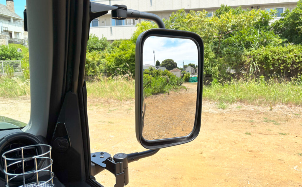 本製品は、縦長で大ぶりなミラー本体と、無骨なU字パイプ形状のステーを組み合わせたトラックミラータイプのドアミラー。近年のカスタムトレンドでもあるクラシック志向を色濃く反映したデザインで、装着するだけでジムニーの表情を大きく変える存在感を放つ。