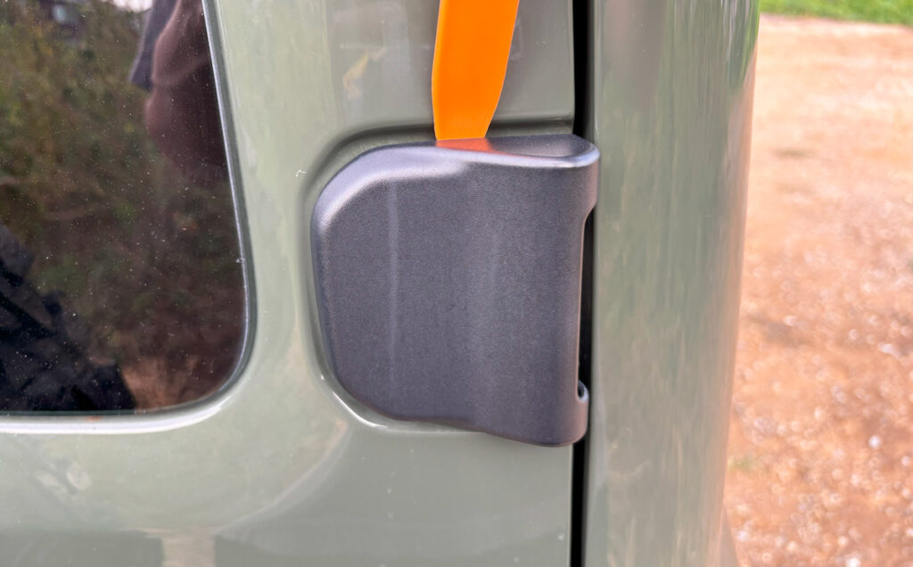 まずは経年劣化で白くなってしまった純正のヒンジカバーをヘラを使って取り外します。