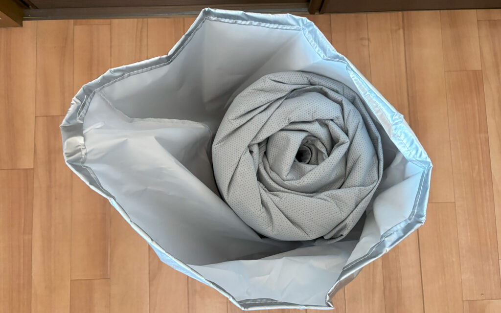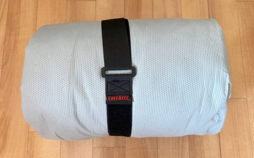 袋から取り出すとボディーカバーがロール状になっており、COVERITEのロゴ入りベルトが巻かれている。