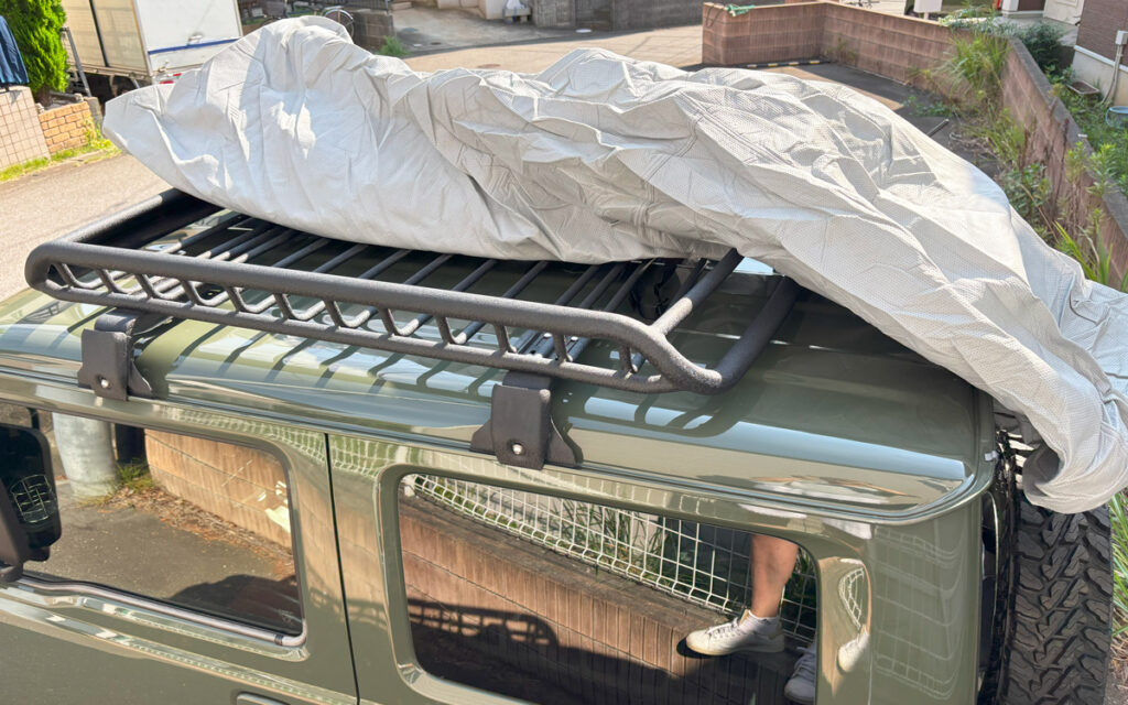 スズキ純正のジムニー専用ボディーカバーもそうだが、ルーフラックを装着しているクルマには対応していない。