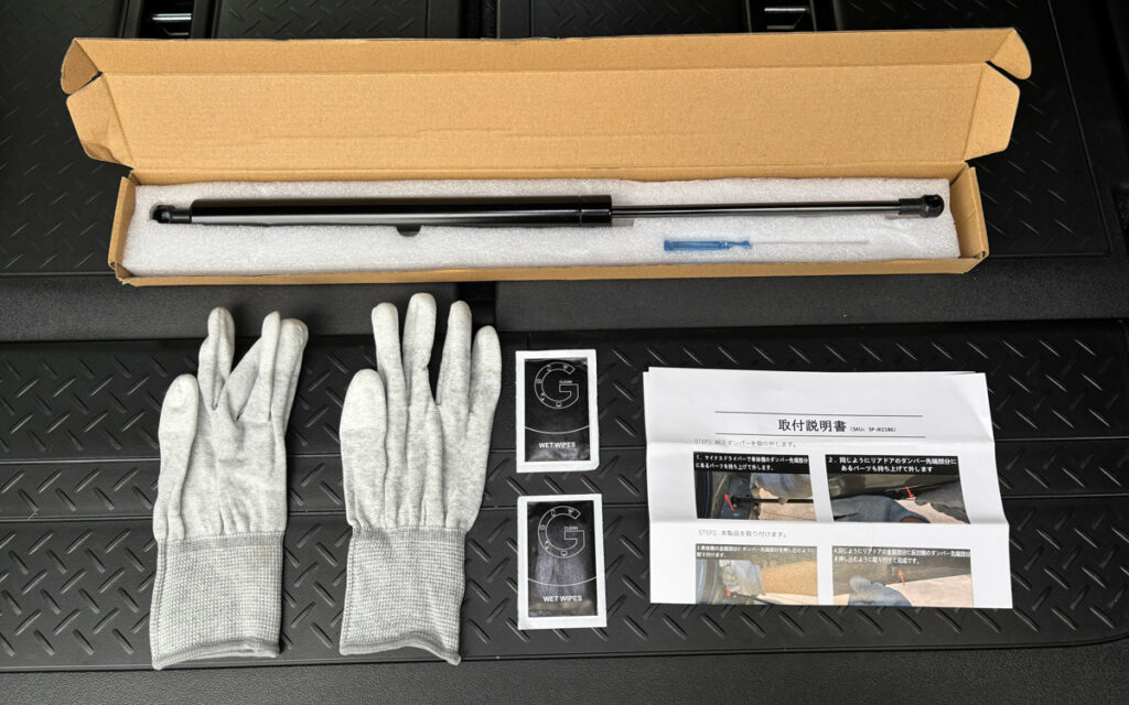 ダンパー本体だけでなく、純正ダンパーの取り外しに使用する「マイナスドライバー」や「作業用手袋」「ウェットペーパー」「取付説明書」が入っていました。