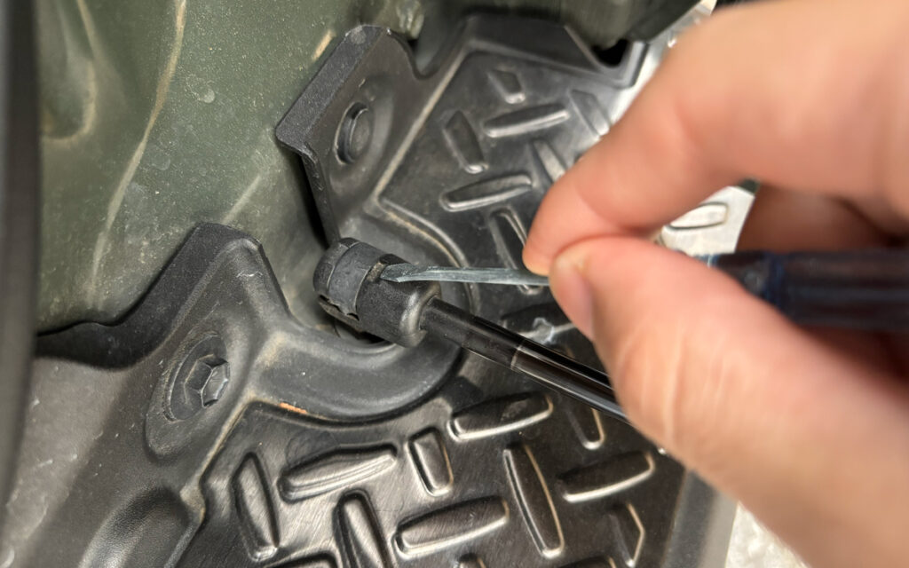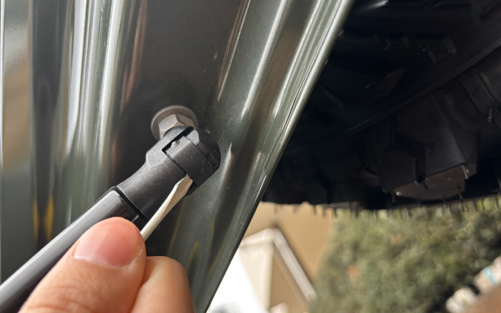 純正ダンパーのボディ側から取り外しをしていきます。付属のマイナスドライバーを使って、写真にある窪みに差し込み、上に持ち上げることで簡単に外れます!